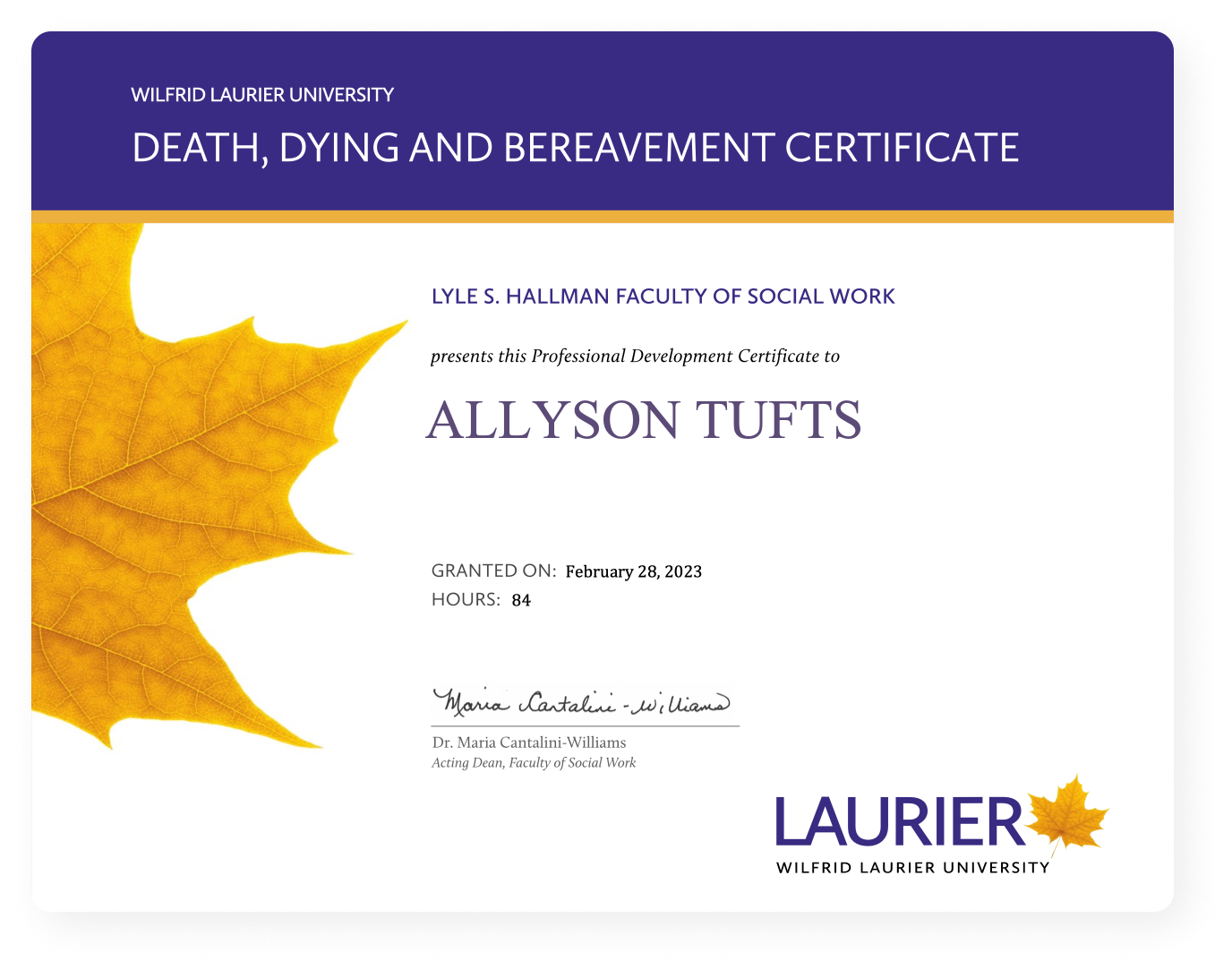 Allyson obtained the Death, Dying and Bereavement Certificate from WIlfrid Laurier University.